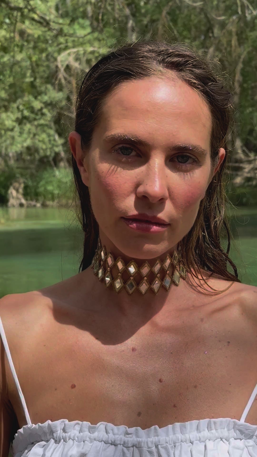 Choker bordado artesanalmente con hilo metalizado y piedras de espejo selladas una a una. Pieza irregular y única.
